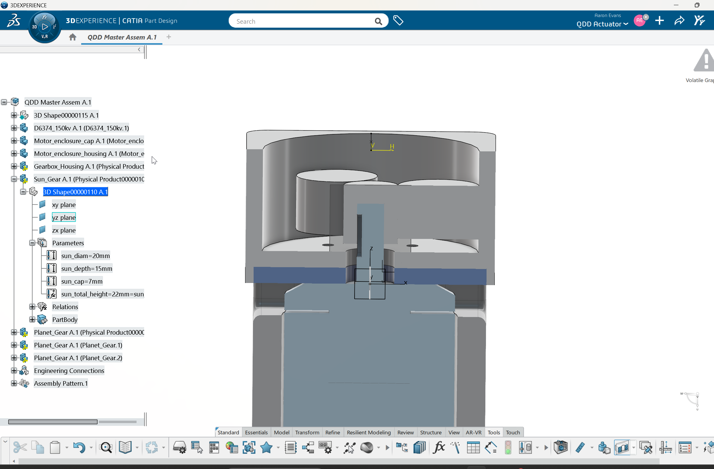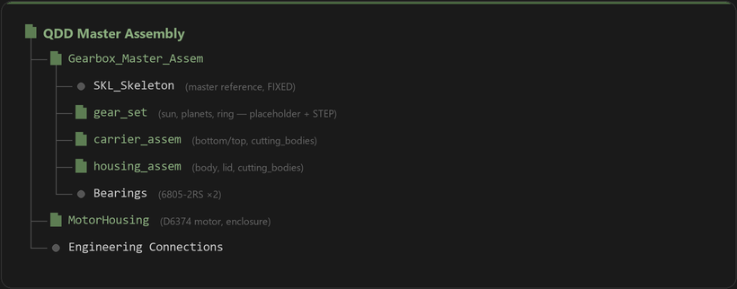 A QDD uses a low-ratio gearbox to get torque multiplication without the reflected inertia penalty of a high-ratio reduction. Keeping the ratio low helps preserve backdrivability and makes impedance control more practical, which is why low backlash and low friction mattered throughout this design. For this project, we went with a 5:1 planetary layout and a 3D-printed prototype on a Bambu P1S.
