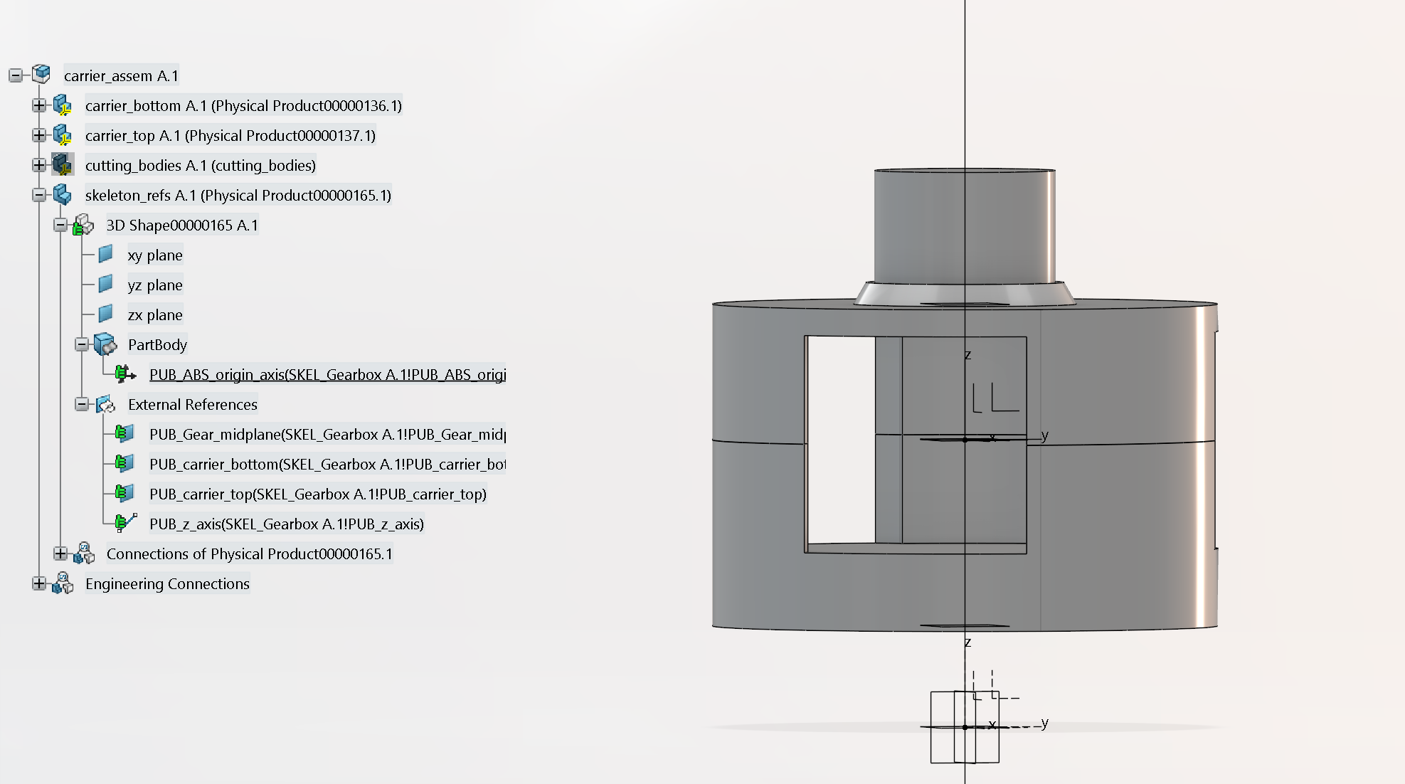 The assembly is skeleton-driven: one master part holds the main parameters, reference planes, and axes. The rest of the parts reference that skeleton, so when I change a key dimension the related parts update with it.