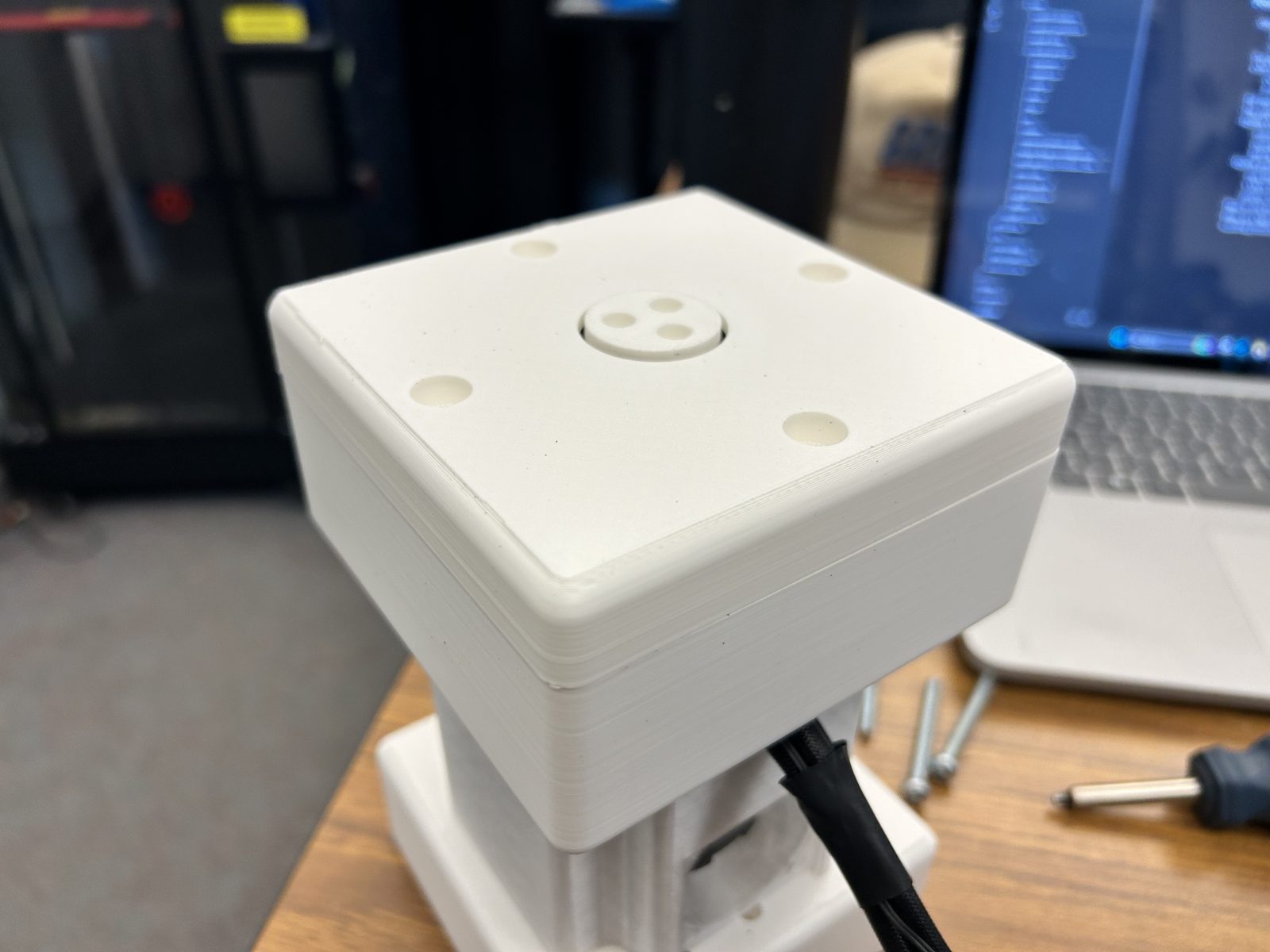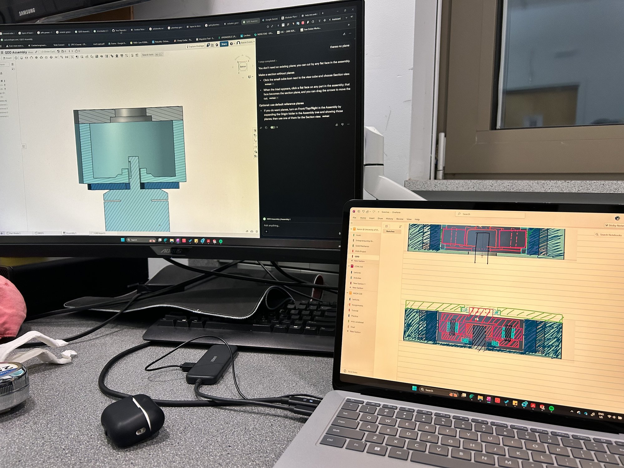 The first concept pass happened in Onshape during the original hackathon day. I rebuilt the project in CATIA because I wanted to learn the CAD software used in a lot of industry work. About 60-80 hours of self-directed learning went into that assembly, much of it in rebuilding the model so future parameter changes would not break downstream parts.