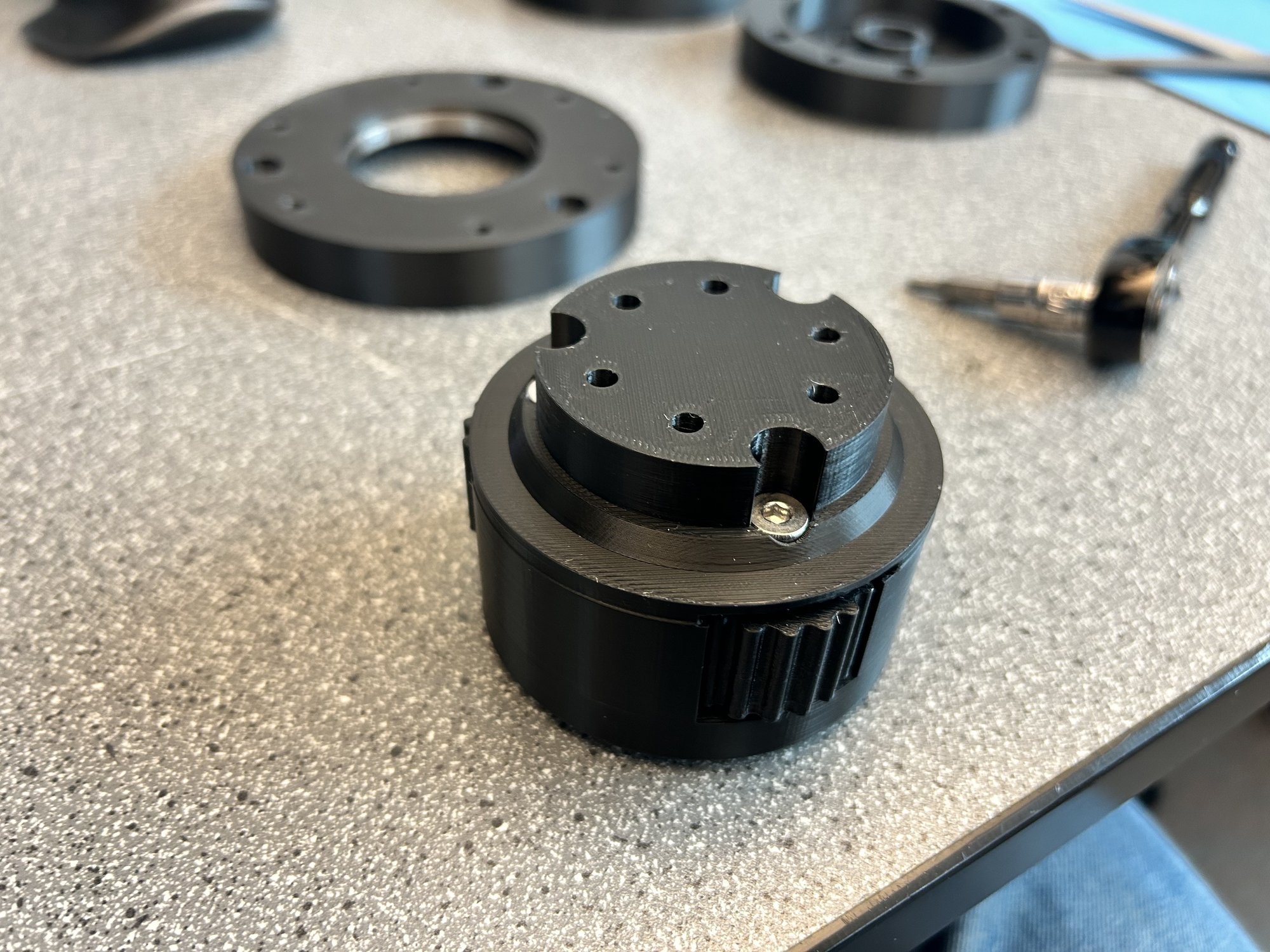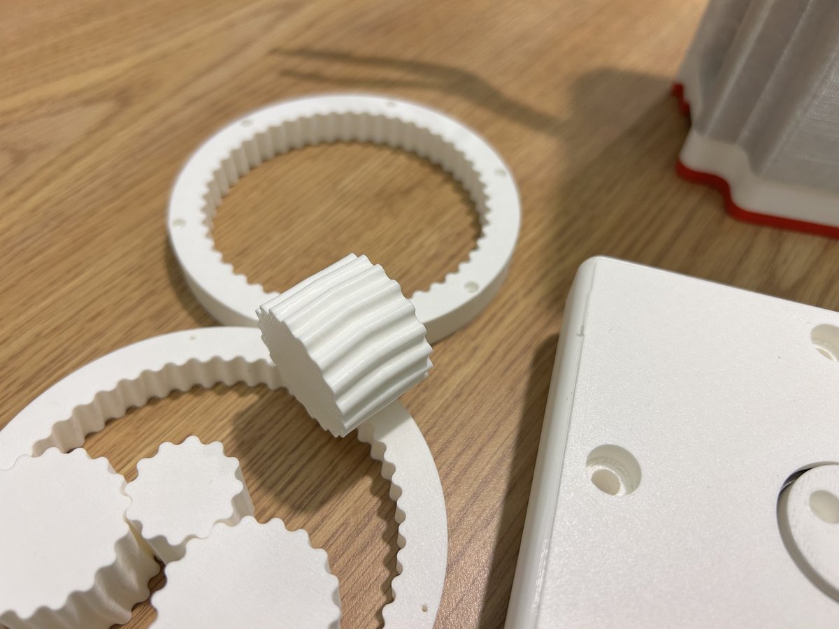 Smaller holes had worse deviation, which makes sense given FDM accuracy scales with feature size. The planet bore and clearance holes needed the largest corrections. I also ended up switching from heat-set inserts to self-tapping screws (M3: 2.6mm pilot, M4: 3.6mm, M5: 4.6mm), which was simpler and worked well for this prototype.